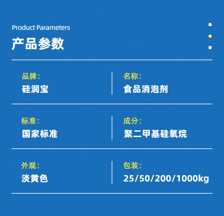 液體消泡劑(乳化硅油)為乳白色粘稠液體,無味,化學性能穩(wěn)定,在常溫和加熱狀態(tài)下均有良好消泡效果。液體消泡劑(乳化硅油)消泡速度快、抑泡時間長,無固體不溶物,易于分散,不影響食品原有的風味,不改變物料的性質和狀態(tài),耐溫性能好,使用方便.